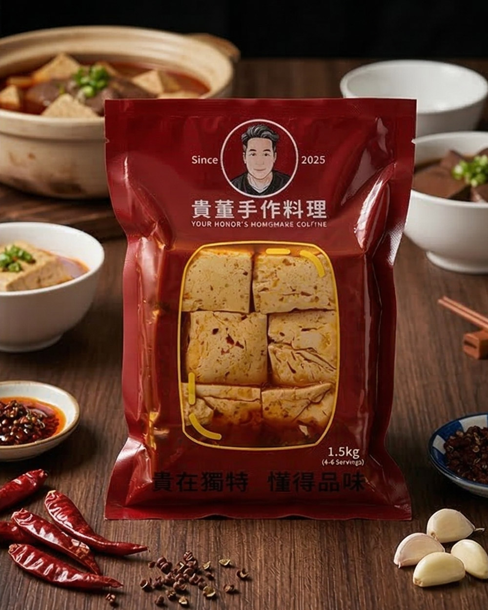 鍋底以多種海鮮乾貨與山產長時間燉煮,層層堆疊出濃郁香氣,再搭配嚴選臭豆腐,成就了這道鮮香麻辣、風味濃厚卻不死鹹的「麻辣臭豆腐」。太太第一次品嚐後驚為天人,從此三不五時就指定要再煮。在眾人的鼓勵與期待之下,決定將這份愛妻料理正式商品化,與更多人分享。